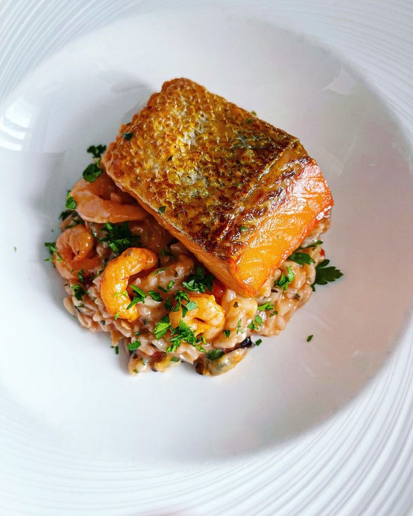 This dish is all about balance and restraint — letting premium ingredients speak, without shouting.The salmon is gently pan-seared until the skin turns crisp and golden, while the flesh stays soft, rich, and just blushing in the centre. Beside it, sweet hand-dived scallops are kissed briefly by a hot pan, forming a caramelised crust that