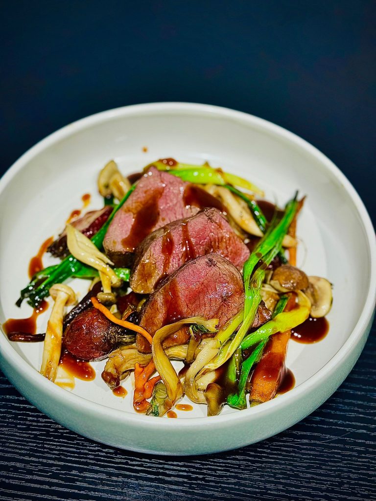 Seared Venison Loin with Caramelised Baby Roots, Wild Mushrooms & Honey-Glazed Leeks