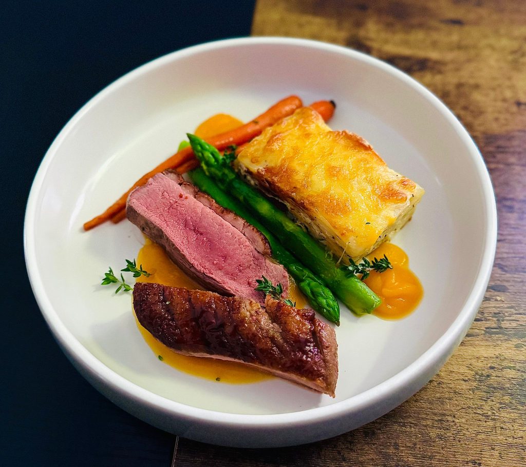 The dauphinoise quietly transforms in the oven, layer by layer, turning soft and silky under a blanket of warm cream and garlic. The carrots pick up a deep caramelisation that reminds you why simple ingredients can taste luxurious when treated with respect. And just when the dish feels rich and comforting, the butternut squash brings that gentle heat — not overpowering, just enough to wake up the plate and give it personality.