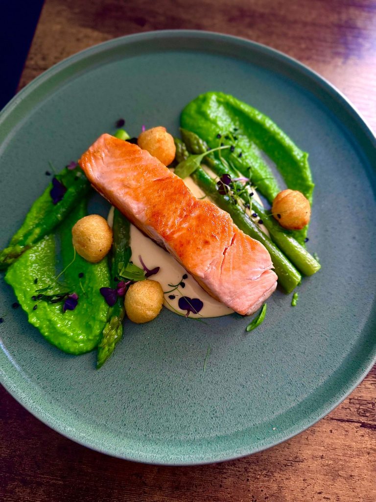 There’s a quiet kind of beauty in a dish like this — something that speaks more through balance than complexity. The salmon, seared just long enough for the skin to crisp and the flesh to flake gently beneath the fork, rests over a soft layer of hollandaise that brings richness without heaviness. Around it, a purée of peas and spinach gives a fresh, vibrant contrast — that touch of green that feels alive on the plate.